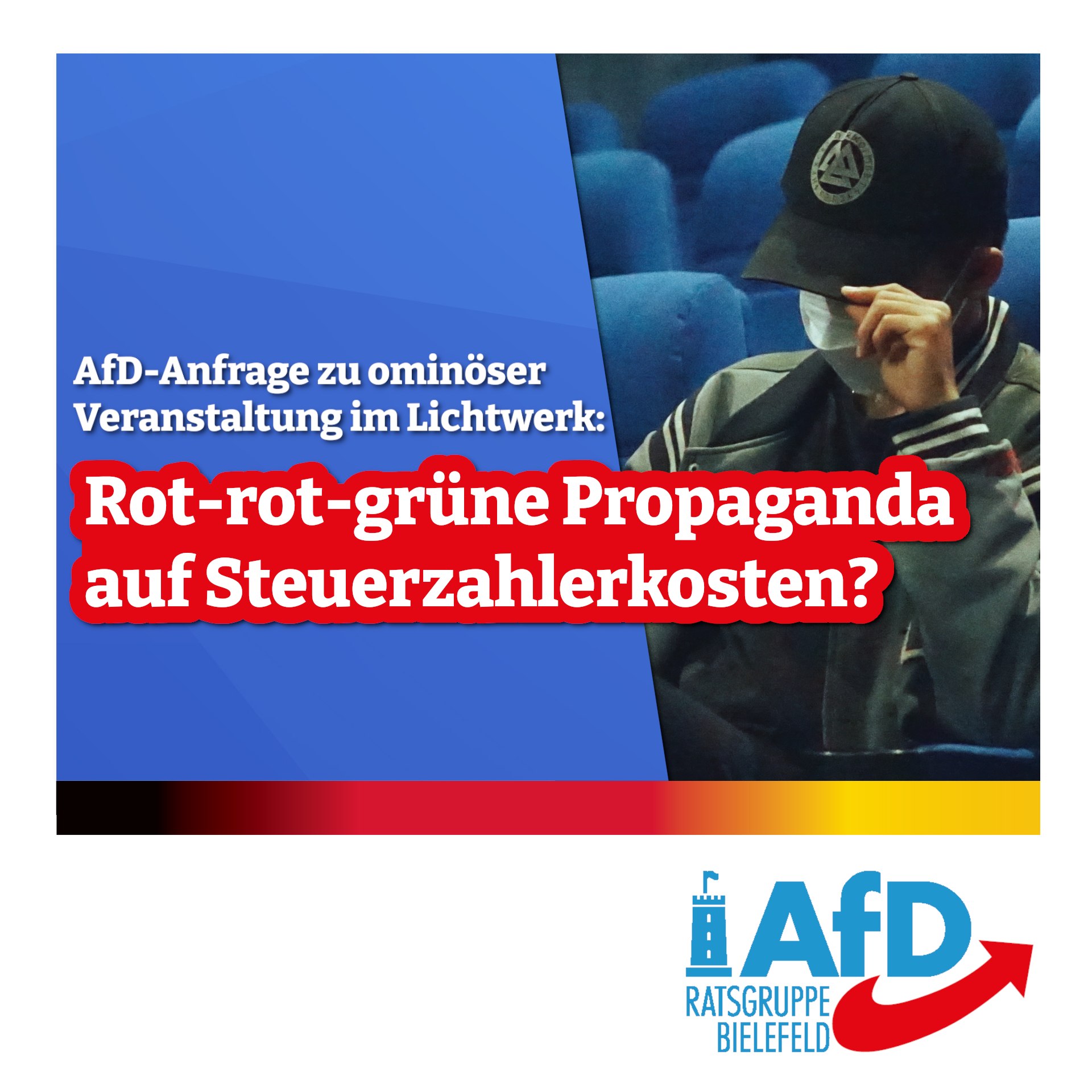 „Fast wie in Hollywood“, feierte das Westfalen-Blatt den neuen Imagefilm „Bielefeld fährt Rad“, der vor kurzem im Bielefelder Kino „Lichtwerk“ gezeigt wurde und in welchem auch SPD-Oberbürgermeister Pit Clausen zu sehen war. Wie viel den Steuerzahler die Vorstellung der dreitägigen Produktion mit 49 Schauspielern an 18 Orten gekostet hat, wurde leider verschwiegen.Worüber ebenfalls nicht berichtet wurde, ist die Information, wie sich die Gästeliste für die Präsentation im Lichtwerk zusammensetzte. Handelte es sich um eine öffentliche Veranstaltung oder waren neben den 49 Darstellern nur ausgewählte Personen eingeladen?Um Licht in das Dunkel zu bringen, haben wir als AfD-Ratsgruppe eine Anfrage an die Stadtverwaltung gestellt, die genau diese Frage beantworten soll. Außerdem haken wir nach, welche Kosten der Stadt Bielefeld bei der Veranstaltung entstanden sind und wie sich diese aufteilen.