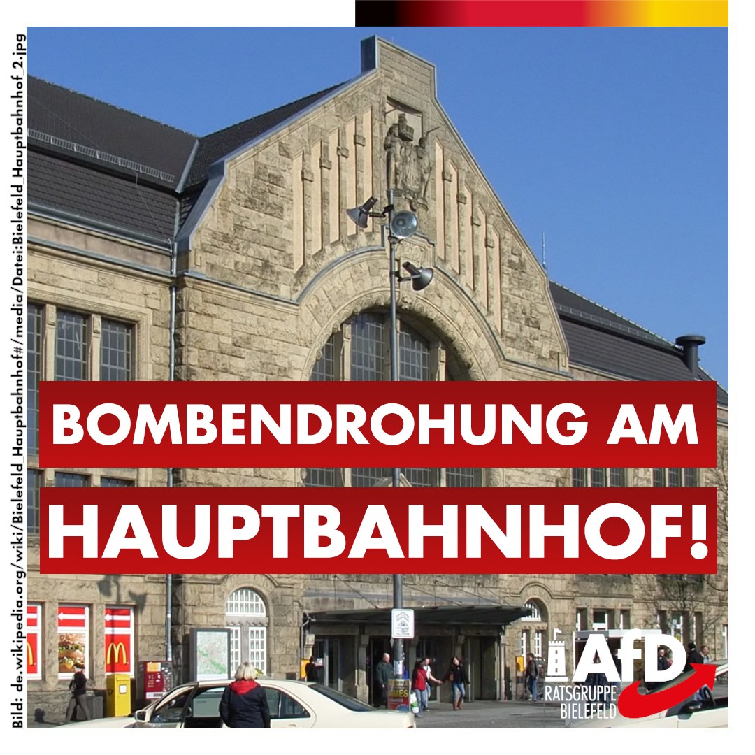 Wegen einer Bombendrohung wurde der Bielefelder Hauptbahnhof am ersten Weihnachtsfeiertag für mehrere Stunden abgeriegelt. Die Bild-Zeitung berichtete von einem Mann, der gegen 15:20 Uhr bei der Polizei angerufen und mitgeteilt habe, dass in den nächsten Minuten eine Bombe am Bahnhof explodieren würde. Mit Maschinenpistolen bewaffnete Beamte haben das Gelände angeblich umstellt, während Sprengstoff-Spürhunden den Hauptbahnhof absuchten.