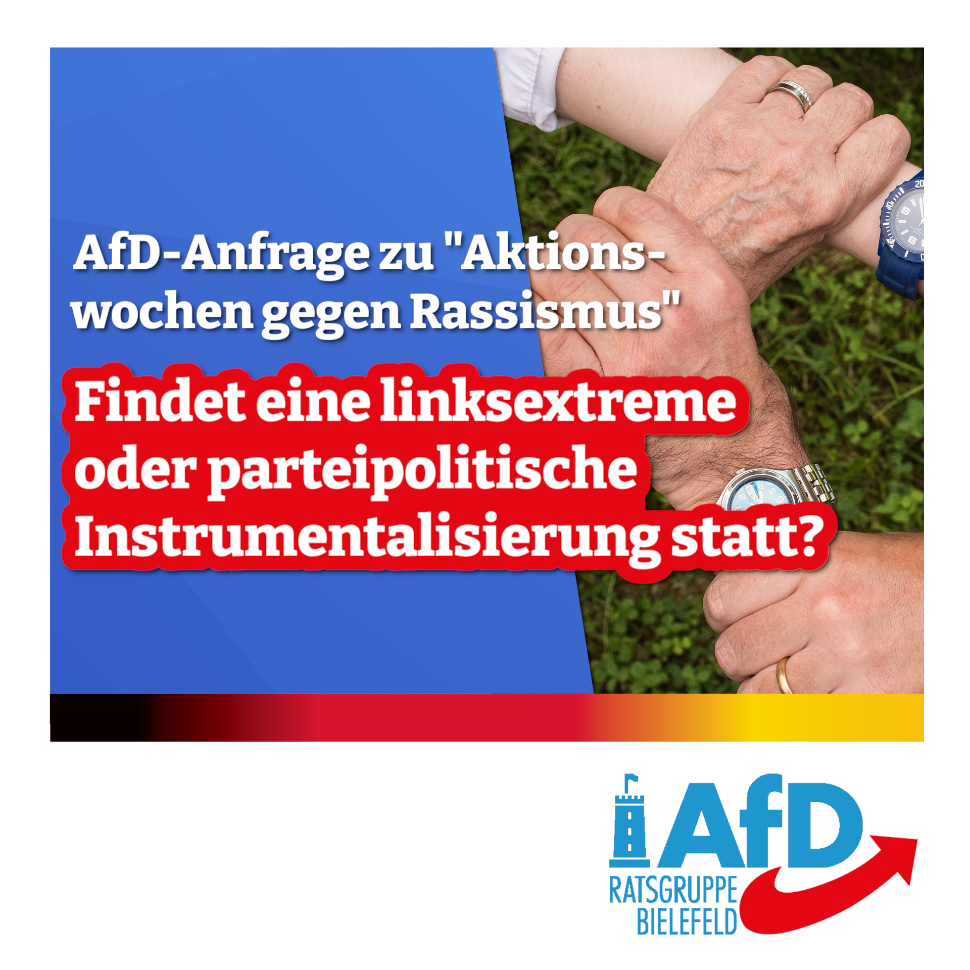 Aus diesem Grund hat die Ratsgruppe der AfD-Bielefeld, auf Initiative Ihres Vorsitzenden, Dr. Florian Sander, eine Anfrage an die Stadtverwaltung gestellt: “Wir möchten wissen, wie gewährleistet wird, dass das Kommunale Integrationszentrum im Zuge der „Aktionswochen gegen Rassismus“ nicht mit linksextremen oder islamistischen Akteuren, Personen, Gruppierungen oder Organisationen zusammenarbeitet und die Kommune dadurch nicht indirekt deren Aktivitäten fördert. Das schließt auch die Frage ein, wie garantiert wird, dass die Veranstaltung nicht zu parteipolitischen Zwecken instrumentalisiert wird, um gegen einzelne, missliebige Gegner Stimmung zu machen.“