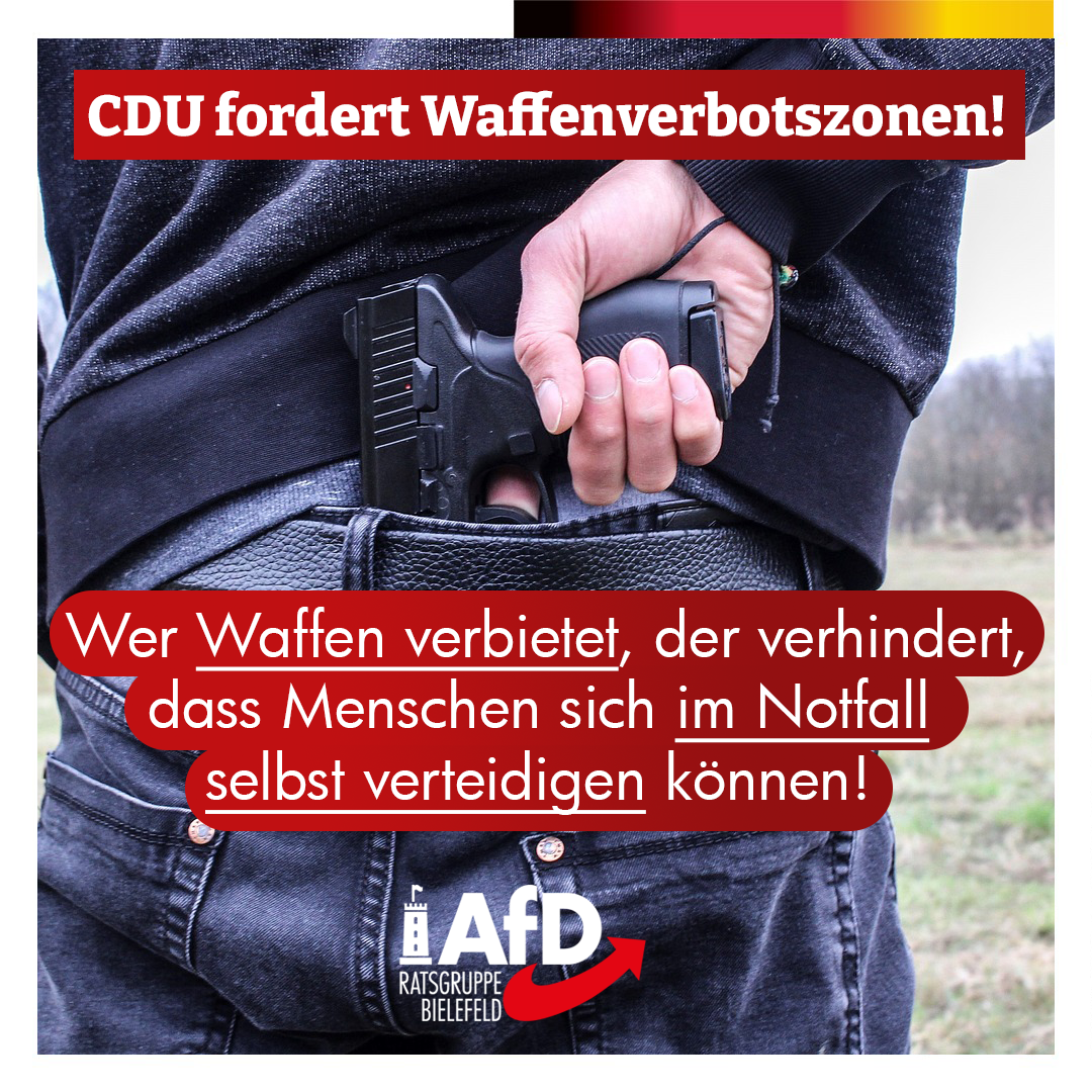 Dr. Florian Sander, Vorsitzender der AfD Ratsgruppe Bielefeld, fasst zusammen: „Bielefeld braucht keine Waffenverbotszonen – die im Übrigen sinnlos sind -, sondern Abschiebungen, stärkere Ordnungsamts- und Polizeipräsenz und gezielte Personenkontrollen von bekannten Tätergruppen. Bürgern zu verbieten, sich selbst gegen Angriffe zu wappnen, ist dabei denkbar kontraproduktiv. Potenzielle Opfer müssen in der Lage sein sich zu verteidigen.“