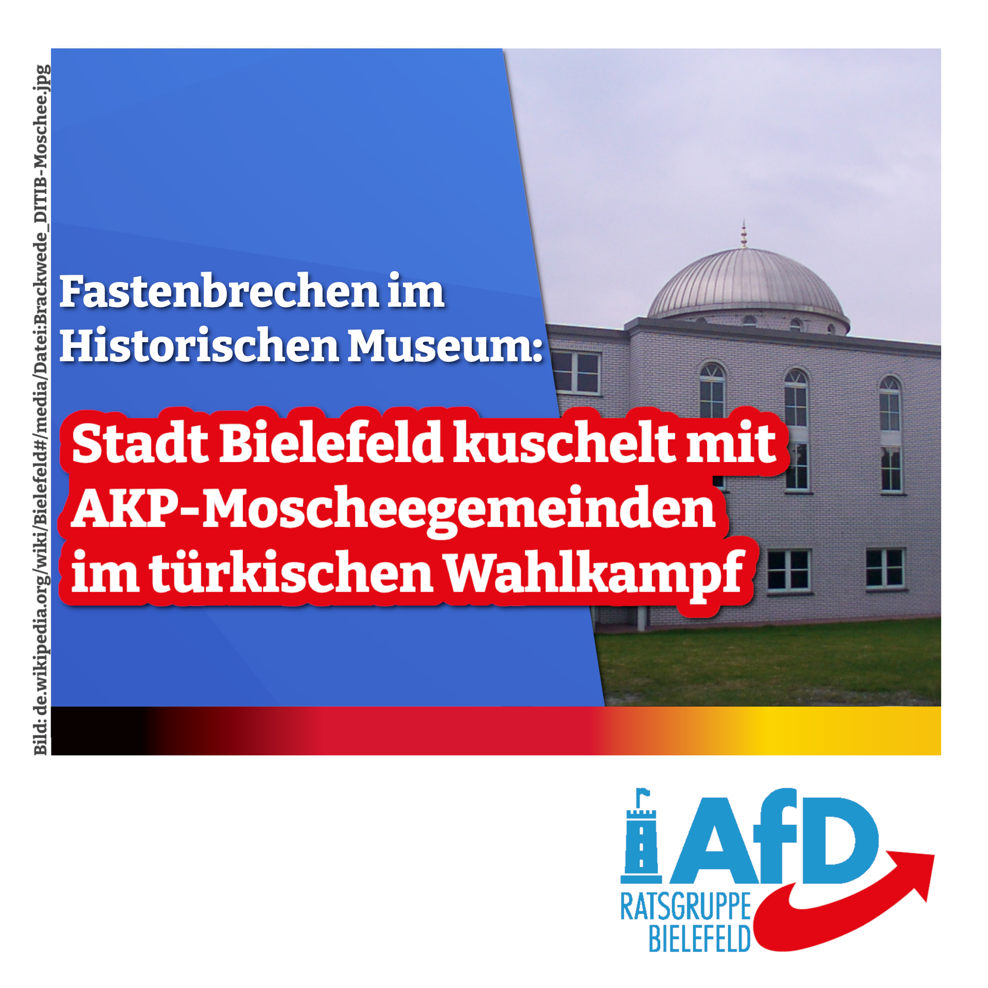 Während sich die AfD immer wieder in öffentliche Räumlichkeiten einklagen muss, haben einige Kommunen bei der Zusammenarbeit mit islamistischen Gemeinden offenbar wenig Vorbehalte. So kam es, dass der Zusammenschluss verschiedener Bielefelder Moscheen namens „Bündnis Islamischer Gemeinden“ (BIG) ein religiöses Essen – das sogenannte Fastenbrechen – im Historischen Museum veranstalten durfte. Die Moscheen der BIG werden zum größten Teil über die Religionsbehörde der türkischen Erdogan-Partei AKP gelenkt. Viele der Gemeinden sollen laut NW auch der orthodox-islamischen Milli-Görus-Bewegung und den Grauen Wölfen nahestehen.