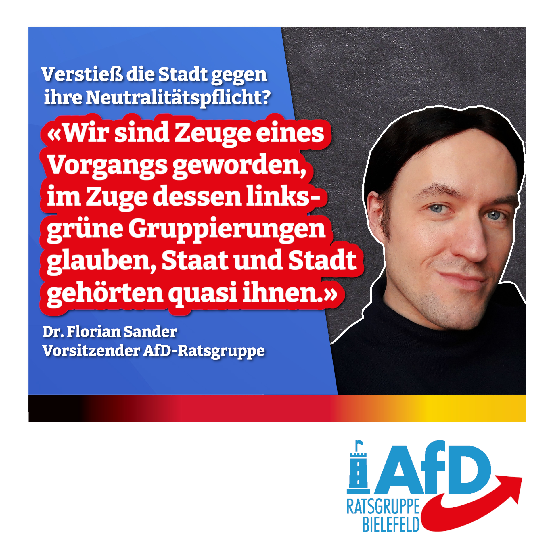 Für Dr. Florian Sander, den Vorsitzenden der AfD-Ratsgruppe Bielefeld, ein handfester Skandal: „Der Auftritt eines Stadtarchivars, also eines Mitarbeiters einer öffentlichen Einrichtung, bei einer politischen Kundgebung – wohlgemerkt in dieser Funktion angekündigt und nicht rein privat – wirft bereits jede Menge Fragen nach der Einhaltung der Neutralitätspflicht auf. Dass aber die Kundgebung auch noch offen auf der Homepage von Bielefeld Marketing beworben wird, macht einmal mehr deutlich, dass die Stadt auf allen Ebenen an einem strukturellen Neutralitätsdefizit leidet und man scheinbar nicht einmal mehr einen Hehl daraus macht, weil man sich ja des Beifalls der SPD-eigenen Medien gewiss sein kann.“