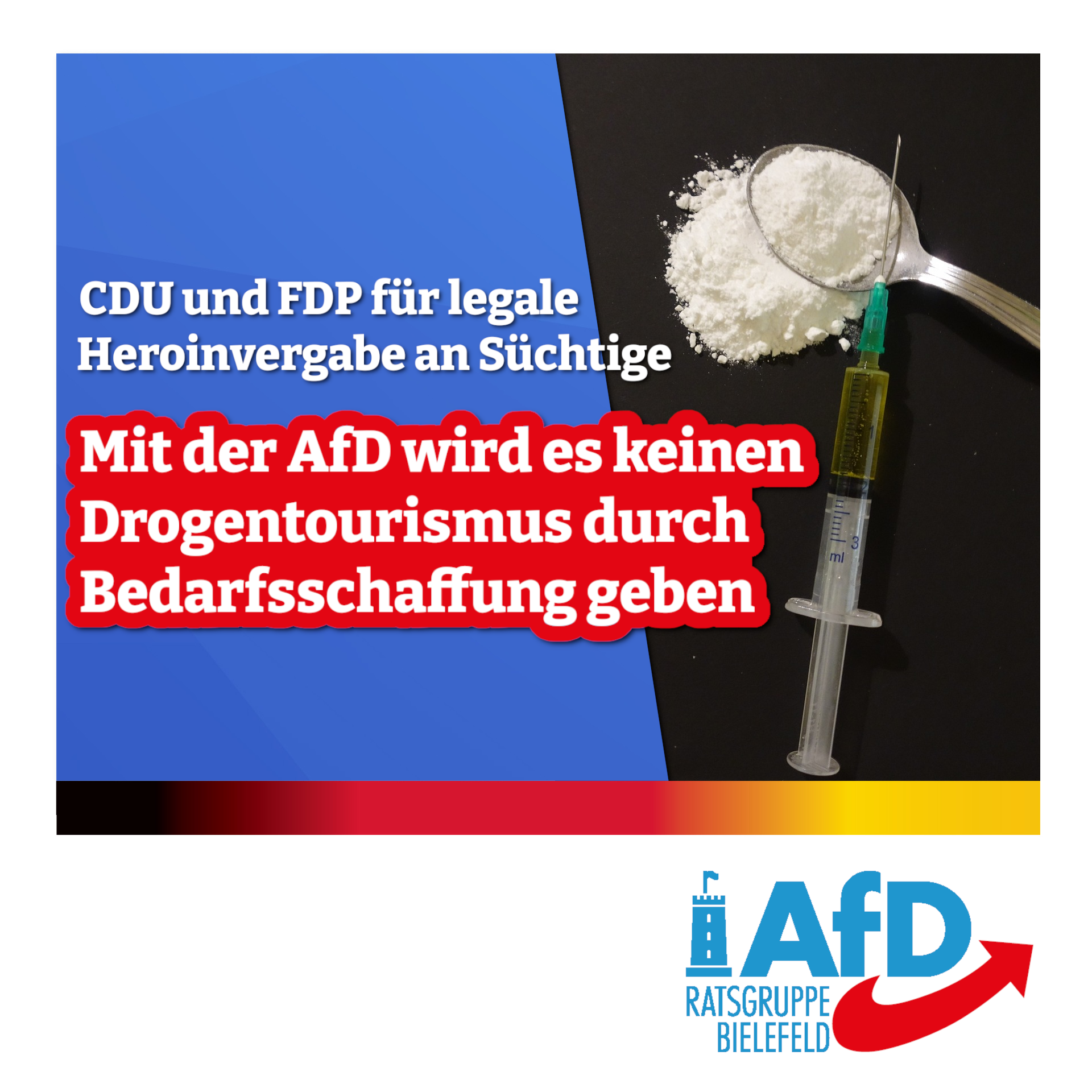 Bereits seit einiger Zeit wird im Sozial- und Gesundheitsausschuss (SGA) der Stadt über das Vorhaben eines Unternehmens, eine Praxis zur „medizinischen“ Heroin-Vergabe im Bahnhofsviertel für 300 Süchtige aus der ganzen Region zu eröffnen, diskutiert. Wir als AfD-Ratsgruppe haben uns bereits im Juni 2022 vehement gegen eine legale Drogenausgabe – erst recht am ohnehin schon von Problem-Klientel hochfrequentierten Hauptbahnhof – ausgesprochen. Wir möchten keinen Drogentourismus in Bielefeld und stellen grundsätzlich in Frage, wie sinnvoll es ist, solche Praxen von in erster Linie gewinn- und profitorientierten Unternehmen betreiben zu lassen.