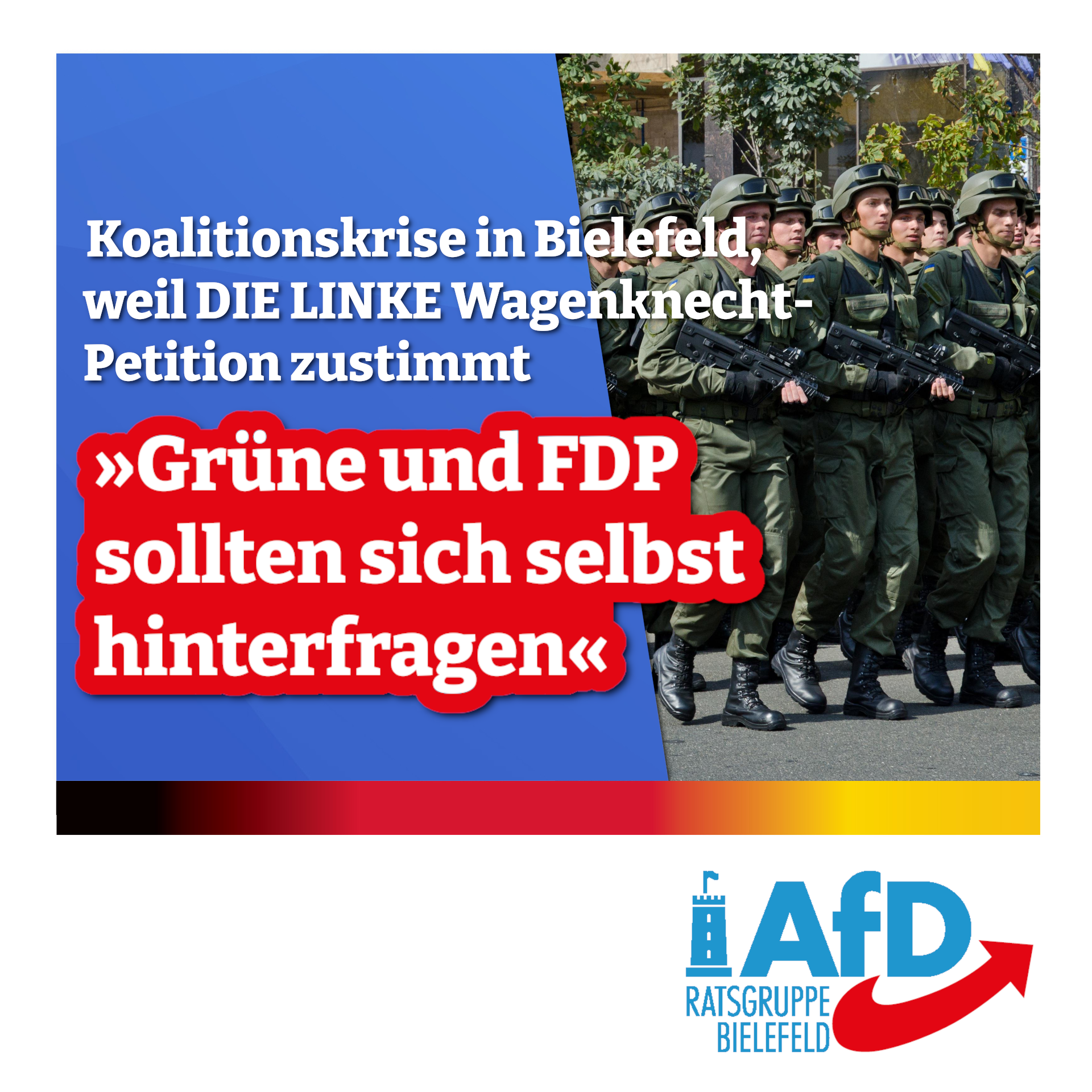 In der Ratskoalition ist ein Streit ausgebrochen, nachdem die Bielefelder LINKE öffentlich ihre Zustimmung zur außenpolitischen Petition von Sahra Wagenknecht erklärt hat. Die Grünen sowie die FDP haben die LINKE dafür öffentlich angegriffen; die FDP forderte ein Ende der Rathaus-Koalition. Dazu erklärt Dr. Florian Sander, Vorsitzender der Bielefelder AfD-Ratsgruppe: