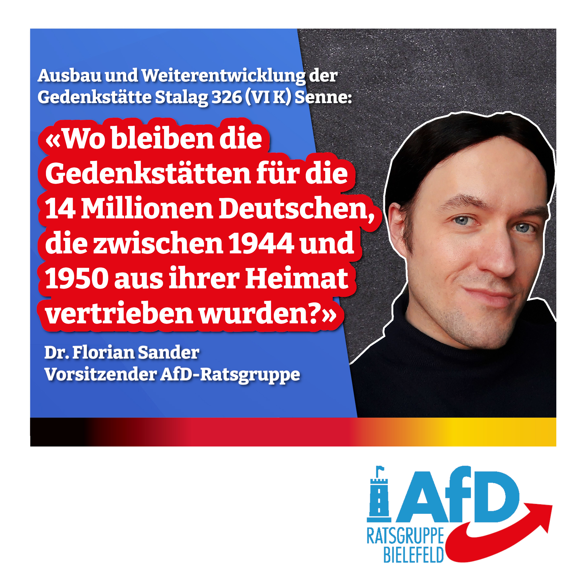 Das ehemalige Kriegsgefangenenlager „Stalag 326“ in Schloß Holte-Stuckenbrock soll für sage und schreibe 64 Mio. Euro erneuert werden. Die Kosten sollen sich Bund, Land und Kommunen teilen. Die Stadt Bielefeld möchte dabei einen sechsstelligen Betrag übernehmen. Die AfD-Ratsgruppe lehnte als einzige Gruppierung des Rates eine Beteiligung an den Kosten ab. Ihr Vorsitzender, Dr. Florian Sander, begründete diesen Schritt in seiner Rede, von der die Grünen-Fraktionsvorsitzende Christina Osei hinterher sagte, der Oberbürgermeister als Sitzungsleiter hätte sie gar nicht zulassen dürfen: