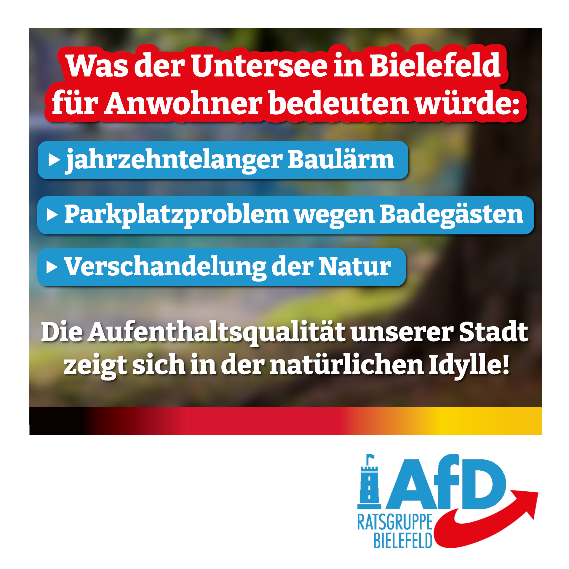 Zur gestrigen Presseberichterstattung über den Streitpunkt „Regionalplan und Untersee“ erklärt Dr. Florian Sander als Vorsitzender und umweltpolitischer Sprecher der Bielefelder AfD-Ratsgruppe:„Trotz möglicher anderslautender Positionierungen von Parteikollegen im Regionalrat oder anderen regionalen Gremien fern der kommunalen Basis sieht die Bielefelder AfD-Ratsgruppe keinen Sinn darin, das leidige Thema Untersee, das seit Jahrzehnten immer wieder aus der ‚bürgerlichen‘ Schublade geholt wird und als Phantom durch die Debatten geistert, erneut auf die politische Agenda zu setzen.Die Idee widerspricht sowohl den Erwägungen des Naturschutzes als auch denen zahlreicher Anwohner der angrenzenden Quartiere und ist, abseits davon, gerade heutzutage auch nicht mehr zeitgemäß. Der Wert und die Aufenthaltsqualität unserer Stadt manifestieren sich auch und gerade in der natürlichen Idylle und in den Sphären der Entschleunigung, die gerade die betroffene Gegend bislang immer auszeichnete. Dies sollte aus unserer Sicht nicht angetastet werden.Wenn nun geprüft wird, ob die Bielefelder Mitglieder des Regionalrates in ihrem Abstimmungsverhalten an Ratsbeschlüsse gebunden werden können, so begrüßen wir dies im Grundsatz. Doch auch abseits formaler Erwägungen täten die Mitglieder des Regionalrates – gleich welcher politischen Couleur – gut daran, bei Entscheidungen von derart großer ökologischer und kommunalpolitischer Tragweite stärker die Beschlüsse und die politische Willensbildung der Gremien und Akteure vor Ort in ihr eigenes Abstimmungsverhalten mit einzubeziehen.“10.07.2023 – Neue Westfälische findet Kampf gegen Mafia-Clans rassistisch