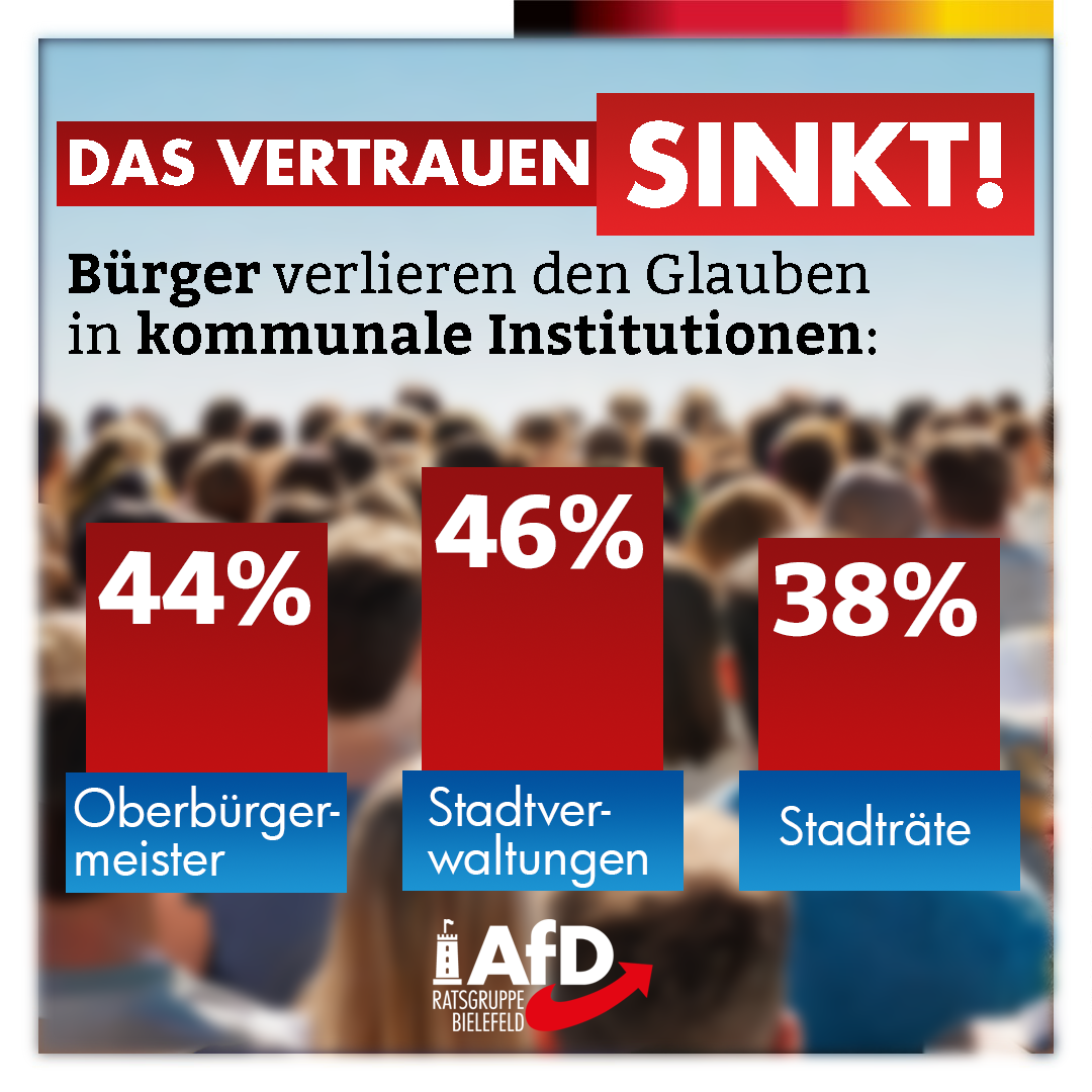 Deshalb haben wir als AfD-Ratsgruppe eine Anfrage an die Stadtverwaltung gestellt. Wir möchten wissen, welche Kenntnisse die Stadtverwaltung über den Vertrauensstand in kommunale Institutionen in Bielefeld besitzt. Außerdem bringen wir in Erfahrung, welche Maßnahmen die Stadtverwaltung ergreift, um das Vertrauen in kommunale Institutionen in Bielefeld zu stärken.