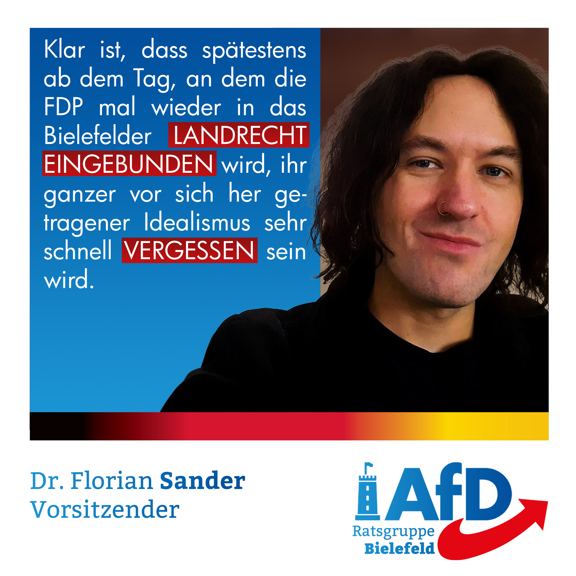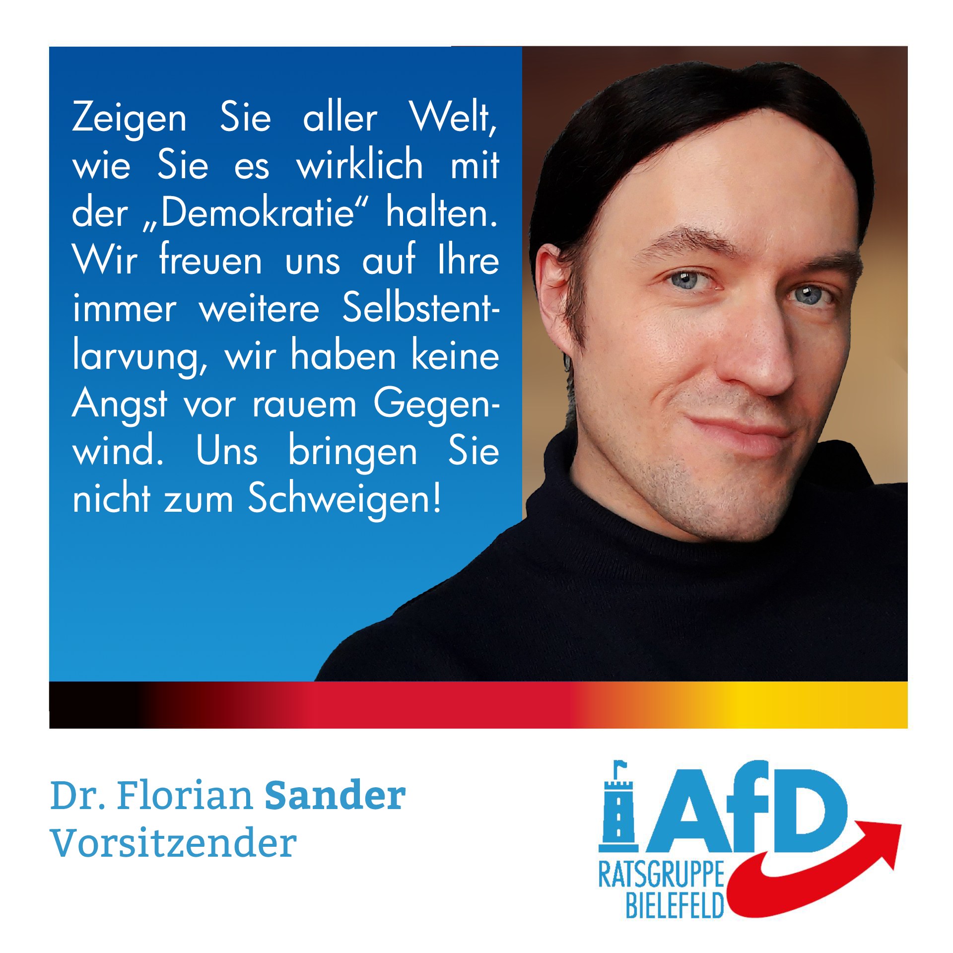 Zu den jüngsten Anwürfen u. a. von Dominic Hallau (Grüne) und Jasmin Wahl-Schwentker (FDP) hinsichtlich der Geschehnisse während der letzten Ratssitzung erklärt Dr. Florian Sander, Sprecher der AfD-Ratsgruppe Bielefeld: