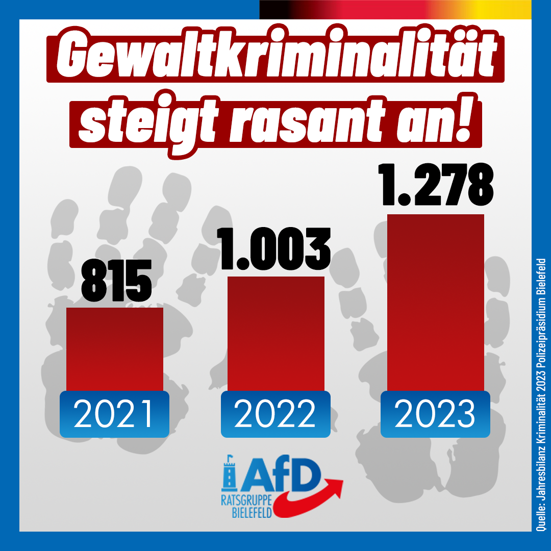 Darauf, dass Kriminalität in Bielefeld ein wachsendes Problem ist, weisen wir als Ratsgruppe Bielefeld regelmäßig hin. Wer regelmäßig Tageszeitungen aus der Region liest, kommt an den täglichen Berichten über Raubüberfälle, Messerstechereien und Belästigungen nicht vorbei. Wie stark der Anstieg der verschiedenen Delikte, besonders der Gewaltverbrechen, aber wirklich ist, zeigt die „Jahresbilanz Kriminalität 2023“ des Polizeipräsidiums Bielefeld. Beinahe alle Deliktskategorien weisen einen Anstieg im Vergleich zum Vorjahr auf. Straftaten gegen das Leben, also Mord und Totschlag, sind 2023 im Vergleich zu 2022 um 25 Prozent angestiegen. Raubkriminalität hat zum Vorjahr um 39 Prozent zugelegt. Auch vorsätzliche leichte Körperverletzung ist angestiegen, genauso wie schwere gefährliche Körperverletzung, die einen Sprung von 29 Prozent nach oben gemacht hat. Und so zieht es sich durch fast die gesamte Jahresbilanz.