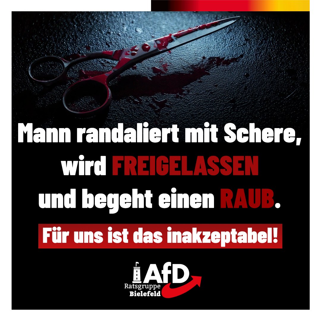 „Es ist inakzeptabel, dass ein Mann, der erst vor wenigen Stunden einen körperlichen Angriff mit einer Schere begangen hat, so schnell wieder freigelassen wird und erneut auf Menschen losgehen kann. Die Sicherheit der Bielefelder muss oberste Priorität haben, und solche Fälle dürfen nicht mit einer bloßen Festnahme enden, nur damit der Täter kurz darauf wieder straffällig wird“, hält Dr. Florian Sander, Vorsitzender der AfD-Ratsgruppe Bielefeld, fest. „Wir fordern eine lückenlose Aufklärung dieses Vorfalls und eine umfassende Prüfung, wie der Schutz der Bielefelder Bevölkerung in Zukunft verstärkt werden kann. Das schließt auch die neue Kooperationsvereinbarung zwischen Stadt und Polizei ein, die nur dann Wirkung entfalten kann, wenn polizeilich einmal als Gefährder erkannte Personen effektiv daran gehindert werden, weitere Straftaten zu begehen.“