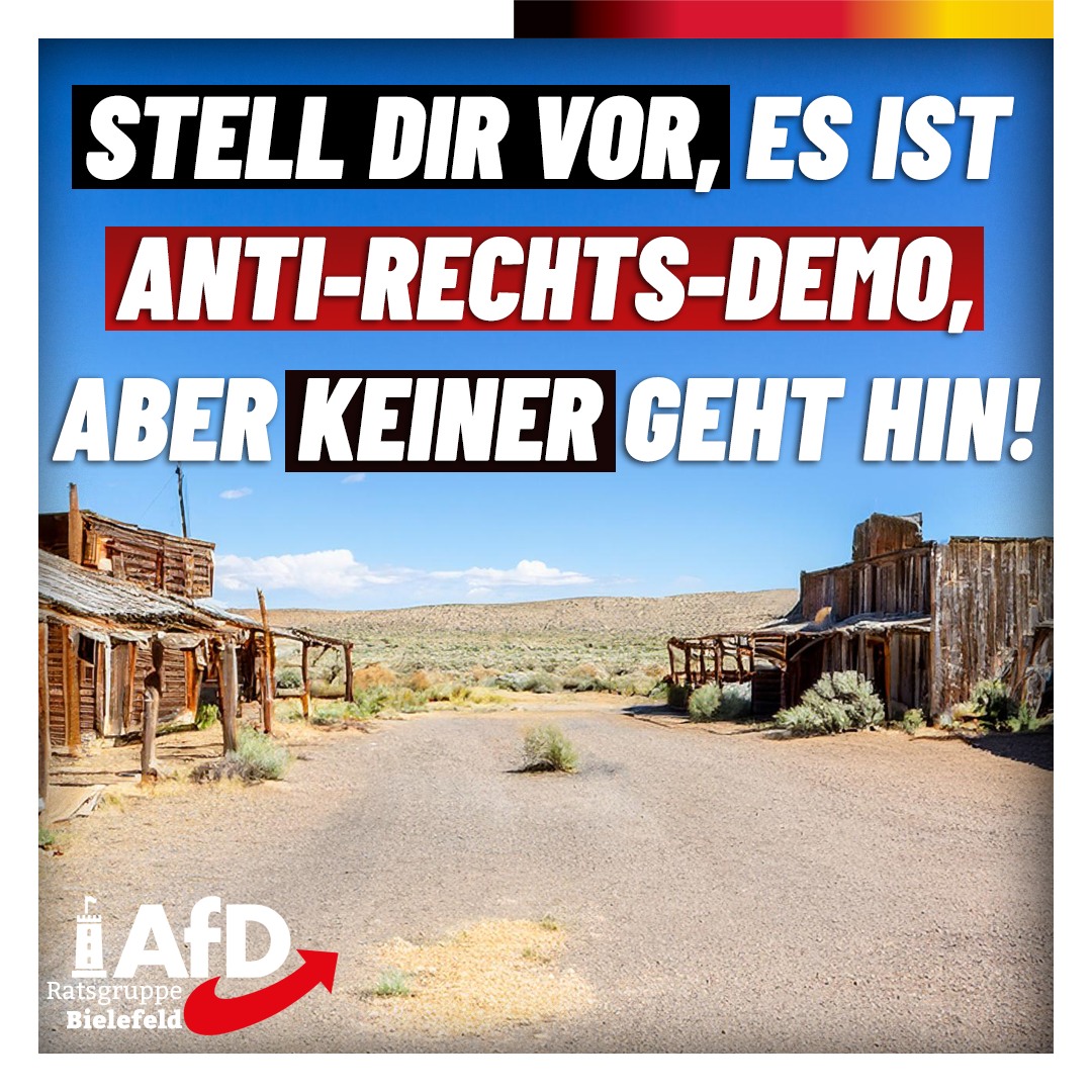 AfD-Ratsherr Maximilian Kneller fügt hinzu: „Bezeichnend ist auch, dass die Veranstaltung trotz reichhaltigen Getrommels der SPD-Zeitung ‚Neue Westfälische‘ im Vorfeld so erfolglos war, auch wenn sie jetzt in ‚Neues Deutschland‘-Manier noch nachträglich hochzujubeln versucht, dass – über den Tag verteilt – ganze 3000 Menschen die Veranstaltung an Bielefelds zentralstem Platz frequentierten – oder ihr nicht ausweichen konnten. Offensichtlich funktionieren selbst die alten Propaganda-Organe des Establishments inzwischen auch nicht mehr.“