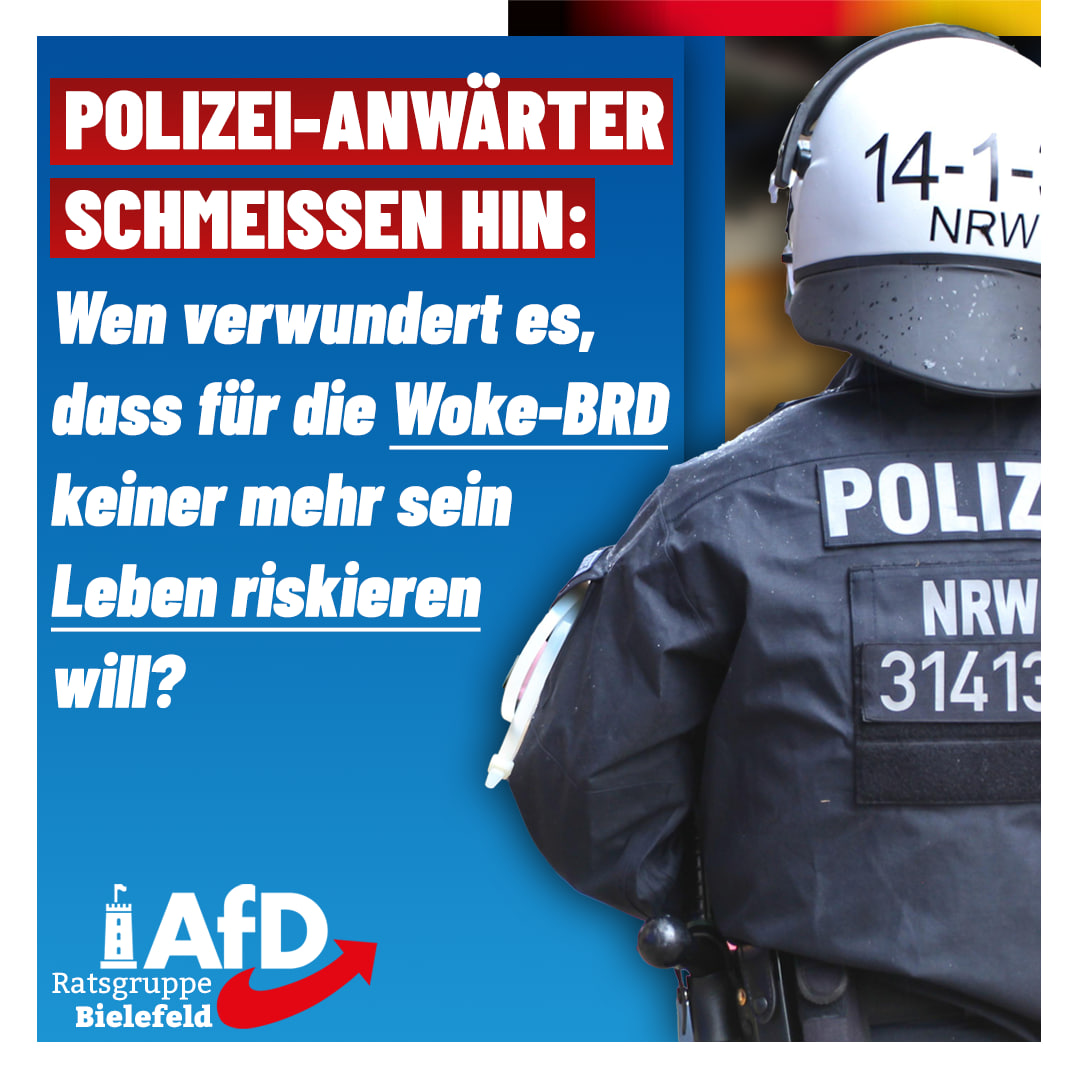 Sander führt weiter aus: „Außerdem sind die Arbeitsbedingungen im Polizeialltag härter denn je. Respektlosigkeit gegenüber Beamten, zunehmende Gewalt sowie die Gefahr der Stigmatisierung im Falle eines entschlossenen Eingreifens gegenüber Migranten sind nur einige der Belastungen, denen Polizisten täglich ausgesetzt sind. Wenn sie nicht von Migranten beschimpft oder angegriffen werden, müssen sie sich von linken Demonstranten beim Schutz eines AfD-Parteitags mit Schlägen und Tritten malträtieren lassen. Und wenn sie sich zur Wehr setzen, laufen sie Gefahr, als Nazis diffamiert zu werden und ihren Job zu verlieren. Hier muss sich etwas ändern, vor allem in der Politik, die innerhalb weniger Jahre tausende Straftäter ins Land geholt hat und den eigenen Polizisten zu wenig Rückendeckung gibt. Auch NRW-Innenminister Herbert Reul und sein Ministerium arbeiten immer wieder daran, Polizeibeamte wegen Gesinnungsdelikten rauszuwerfen, während das Personalproblem immer größer wird. Ist es wirklich verwunderlich, dass eine kunterbunte Woke-BRD nichts ist, für das junge Leute noch als Polizisten oder Soldaten ihre Gesundheit oder gar ihr Leben riskieren wollen? Ist es wirklich verwunderlich, dass eine solche Gesellschaft keine Menschen mehr sozialisiert, die für solche Berufe geeignet sind?“