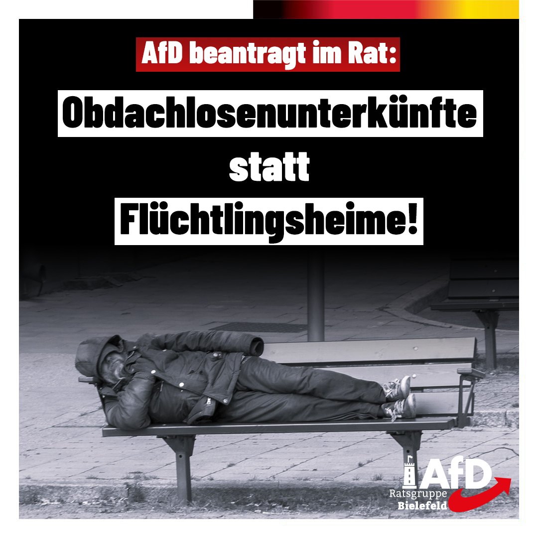 Die FDP hatte deshalb einen halbherzigen Antrag im Sozial- und Gesundheitsausschuss (SGA) eingereicht. Das aus lediglich vier Sätzen bestehende Papier fordert oberflächlich die Entwicklung eines Konzepts zur Unterbringung von Wohnungslosen. Konkrete Alternativen zum ehemaligen Handwerker-Bildungszentrum nennt die FDP jedoch nicht. Kreativer waren die Altparteien bei ihrem Vorhaben, Unterkünfte für Flüchtlinge zu schaffen. Erst Anfang des Jahres berichtete die Neue Westfälische, dass etwa 250 Jugendliche im Alter von 14 bis 17 Jahren, überwiegend aus Syrien und Afghanistan, in Bielefeld eine Bleibe gefunden haben. Die AfD-Ratsgruppe forderte daher in einem eigenen Antrag, dass die Stadtverwaltung prüft, wie viele Plätze für Einheimische ohne Dach über dem Kopf zur Verfügung stünden, wenn dafür Standorte genutzt würden, die bislang als Flüchtlingsunterkünfte dienen. Die Stadt soll sich dafür einsetzen, diese Immobilien für einheimische Obdachlose bereitzustellen.