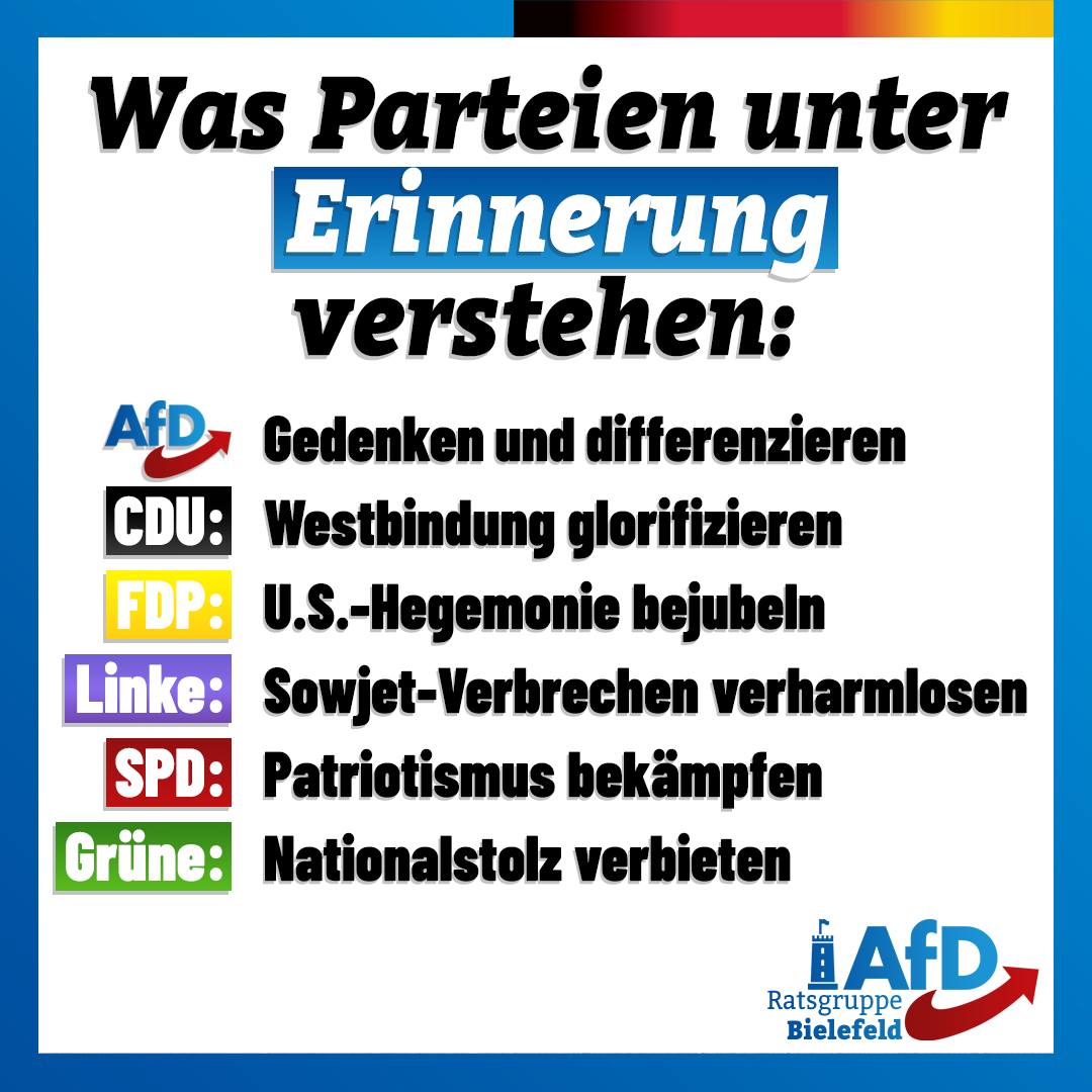 Und genau da liegt bei Ihrer fraktionsübergreifenden Erinnerungspolitik so häufig das Problem – auch heute wieder. Sie verbinden mit dem Gedenken an den 8. Mai 1945 Schlussfolgerungen, die wir nicht teilen können. Mindestens bei CDU und FDP seit jeher etwa das völlig unkritische Bejubeln der Westbindung und der transatlantischen Hegemonie, bei der Linken ein viel zu unkritisches Verhältnis zu den Verbrechen der Sowjetunion, der Roten Armee und des Stalinismus, bei SPD und vor allem bei den Grünen das Motiv, ein patriotisches Selbstbewusstsein der Deutschen dauerhaft zu verhindern.