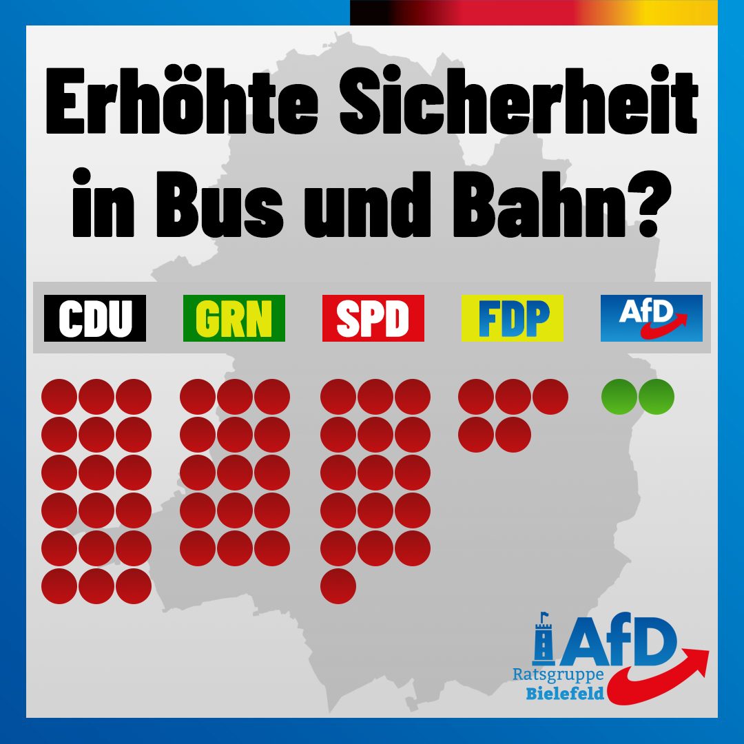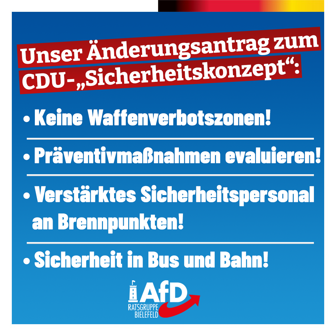 Da die Idee eines Sicherheitskonzeptes gut ist und einige der Forderungen durchaus unterstützenswert sind, hat die Ratsgruppe der AfD auf Initiative ihres Vorsitzenden, Dr. Florian Sander, einen Änderungsantrag im Haupt-, Wirtschaftsförderungs- und Beteiligungsausschuss der Stadt Bielefeld gestellt. Darin wird neben der Streichung der geplanten Waffenverbotszonen gefordert, dass sozialpräventive Maßnahmen künftig von unabhängigen Einrichtungen evaluiert werden, um objektiv prüfen zu können, ob sie auch wirklich so wirksam sind, wie es oft dargestellt wird. Außerdem legt das CDU-Konzept zu wenig Augenmerk auf die Sicherheit in Bus und Bahn. Wir fordern deshalb die Präsenz von Ordnungskräften nicht nur an Brennpunkten, sondern auch im ÖPNV und dessen Haltestellen zu verstärken. Den vollständigen Änderungsantrag können Sie hier einsehen: https://anwendungen.bielefeld.de/bi/getfile.asp?id=798215&type=do