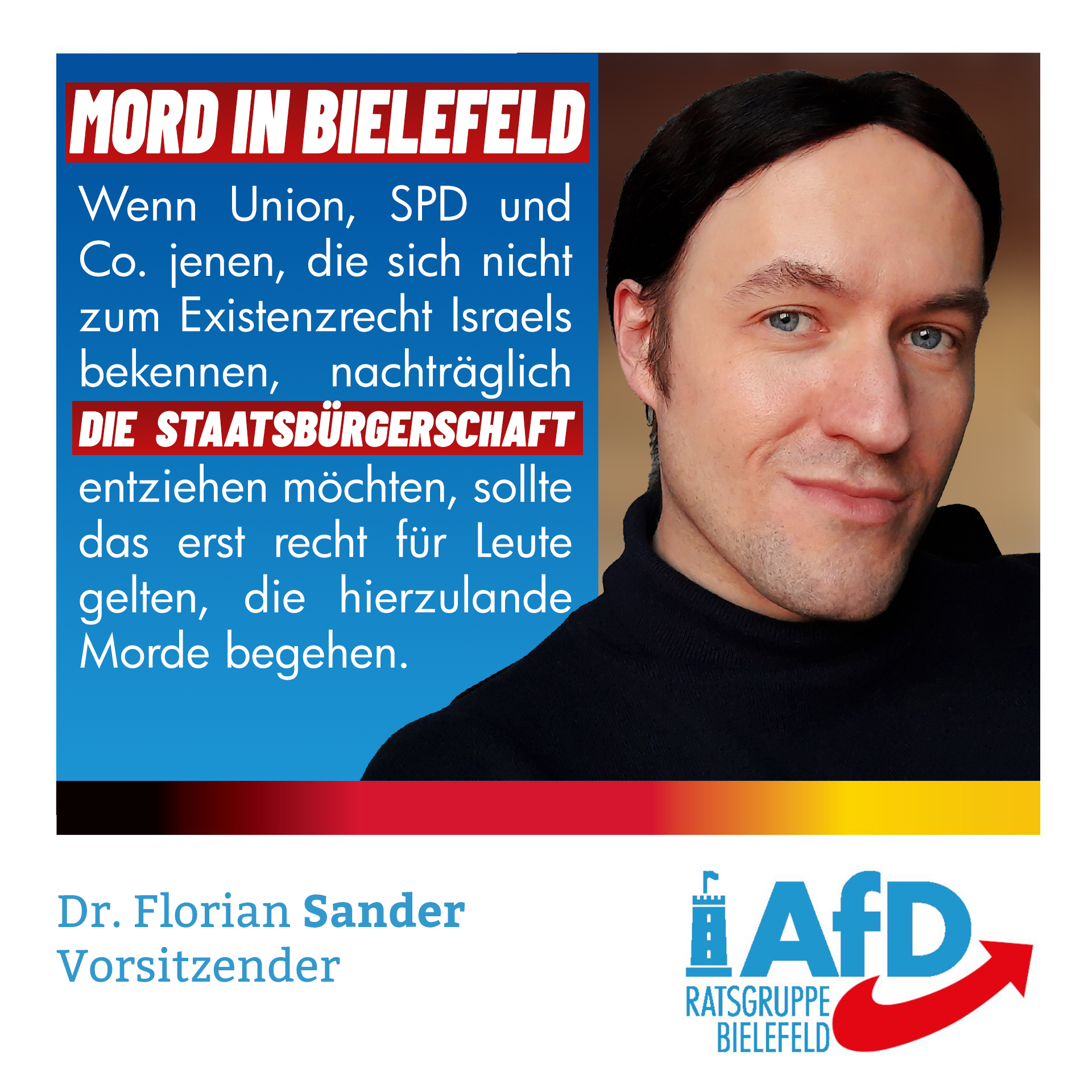 Dr. Florian Sander, Vorsitzender der AfD-Ratsgruppe, fordert: „Stichwort Remigration: Wenn Union und SPD jenen, die sich nicht zum Existenzrecht Israels bekennen, nachträglich die Staatsbürgerschaft entziehen wollen, sollte das in erhöhtem Maße gelten bei Leuten, die Morde (!) begehen. Aber auf solche Rückschlüsse kommt man natürlich nicht, wenn man sich mehr Gedanken darüber macht, die einzige relevante Oppositionspartei zu verbieten statt die Sicherheit im Land wiederherzustellen.“ Sander fügt einen Vorschlag hinzu: „Wie wäre es mal mit einer Umfrage, vor wem die Menschen in Bielefeld mehr Angst haben, wenn sie alte und neue Brennpunkte frequentieren: Vor Rechtsextremen oder vor Ausländerkriminalität? Das Ergebnis dürfte spannend sein – auch deswegen, weil es nicht selten selbst Migranten sind, die Opfer von Migrantengewalt werden, wie dieser Fall wieder eindrücklich zeigt. Und übrigens: Wo bleiben eigentlich die politischen und medialen Aufrufe zu Massendemos gegen Fehden-Morde und Ausländergewalt?“