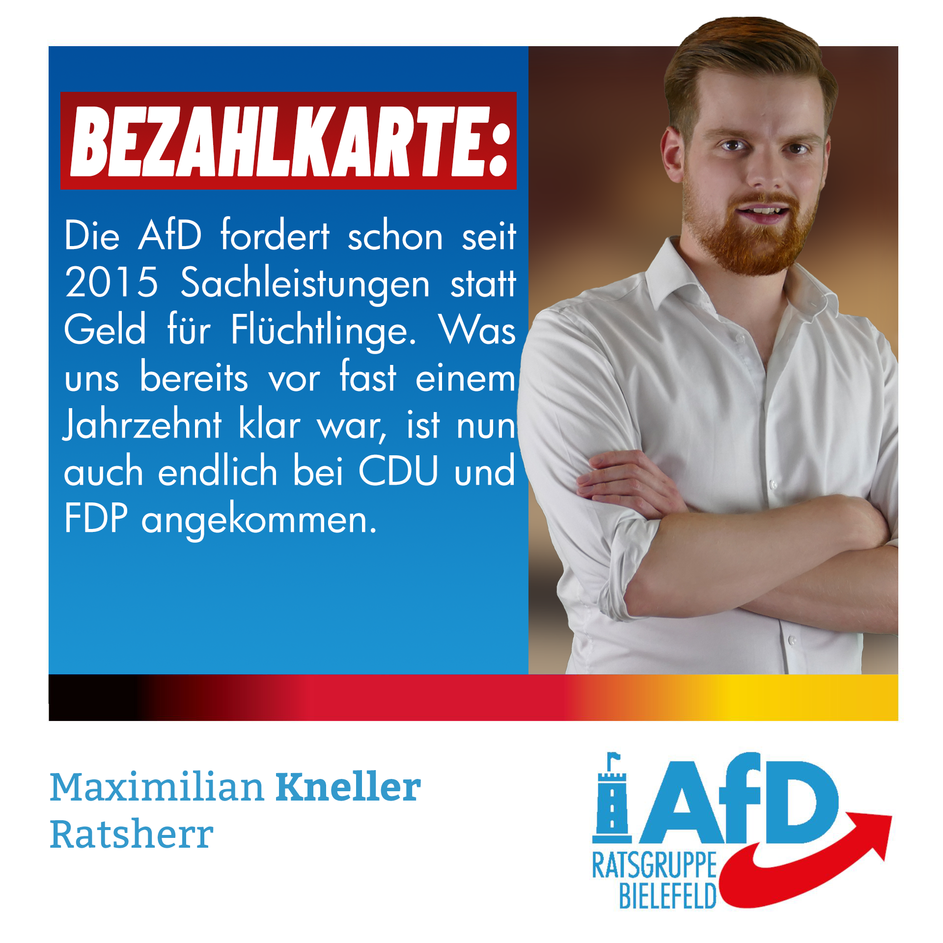 Die AfD fordert seit 2015 Sachleistungen statt Geldleistungen für Flüchtlinge. Was uns schon vor fast einem Jahrzehnt klar war, ist nun auch endlich bei CDU und FDP angekommen – zumindest mancherorts. In Bielefeld fordern die beiden Parteien, die 2015 Millionen Flüchtlinge bei vollen Geldleistungen ins Land gelassen haben, seit kurzem die Bezahlkarte für Flüchtlinge. Natürlich gegen den Widerstand der rot-rot-grünen Ratskoalition.