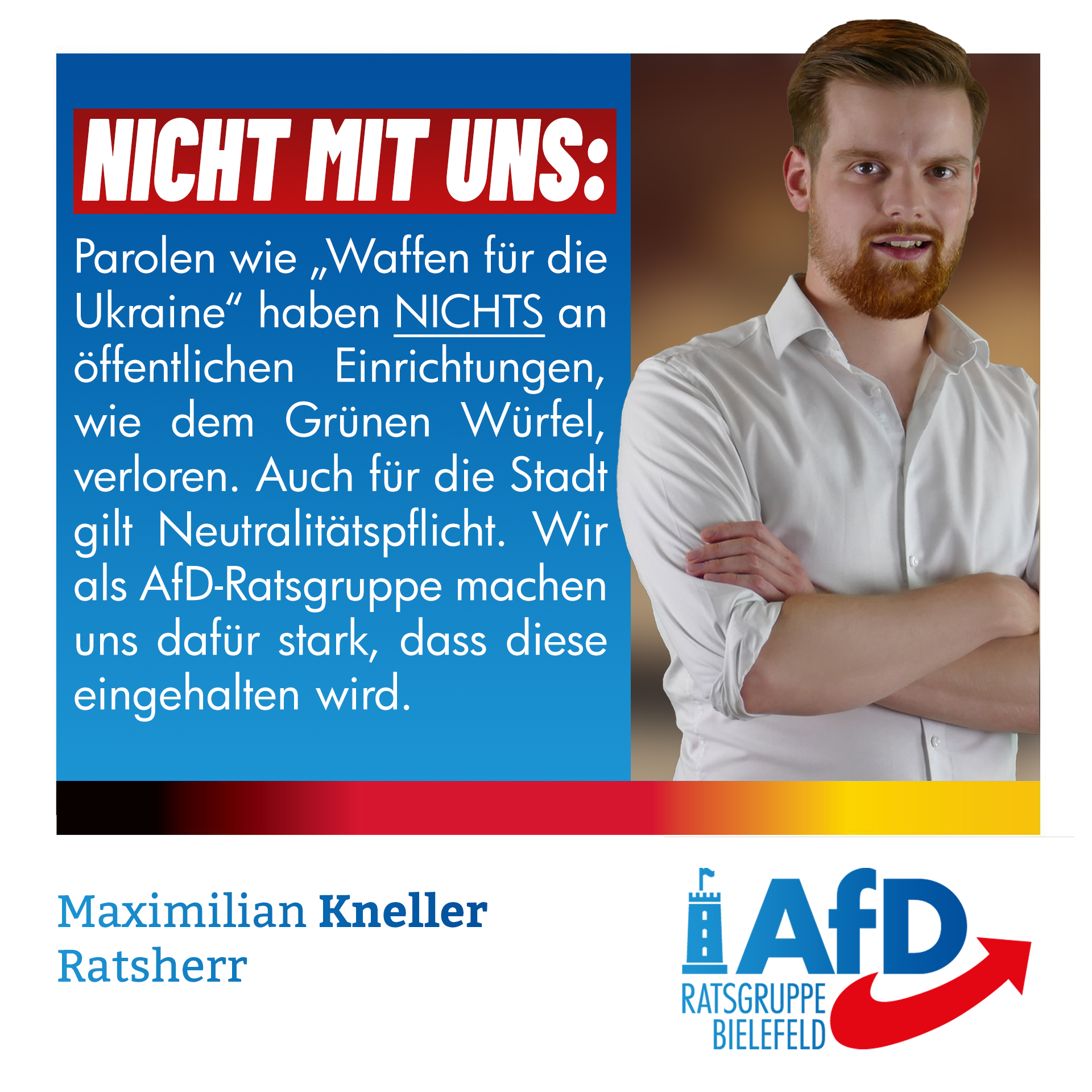 Der Initiator der Anfrage, AfD-Ratsherr Maximilian Kneller, verurteilt die Aktion: „Solche Parolen haben nichts an oder in steuerfinanzierten Einrichtungen zu suchen, genauso wie Organisatoren, die den Krieg in der Ukraine anheizen und damit den Tod zehntausender Menschen befeuern. Aus dem grünen Würfel lässt es sich gemütlich auf städtische Kosten zum Krieg hetzen. Auf dem Weg in die Ukraine, um sich zum Dienst an der Waffe zu verpflichten, befinden sich die wohlstandsverwahrlosten Verfasser dieser Botschaft sicher nicht.“